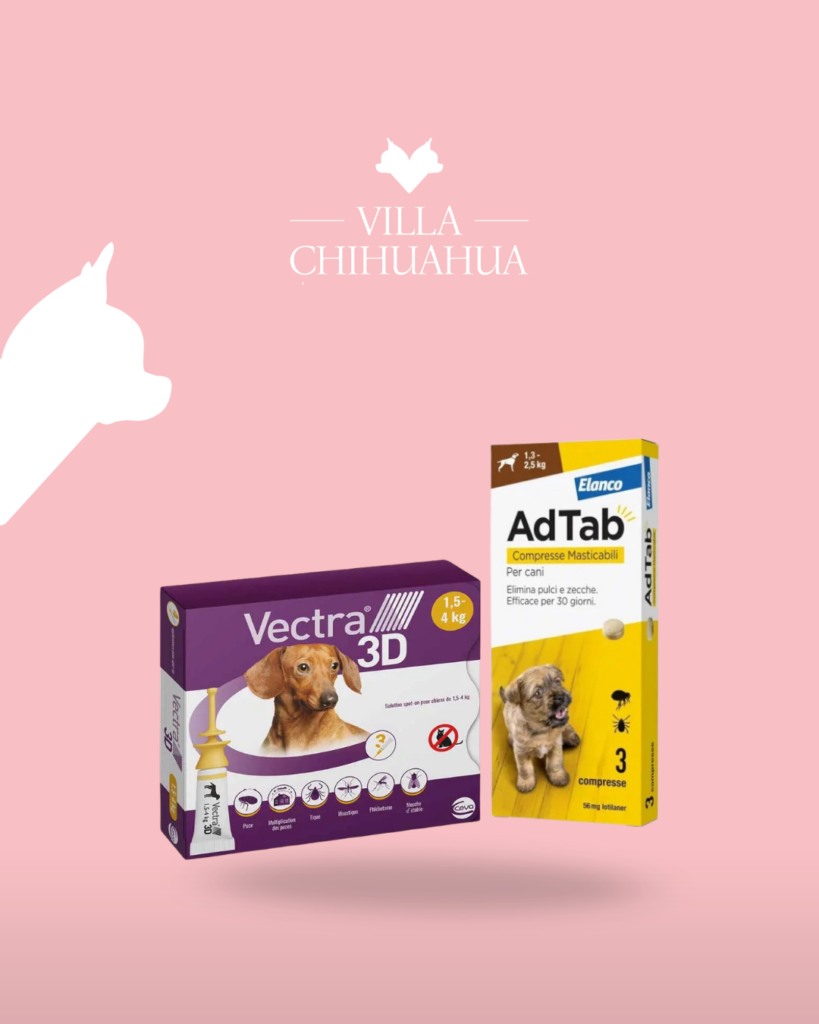 Protezione antiparassitaria completa per cani di taglia piccola come chihuahua, con compresse e spot on. Difesa efficace contro pulci, zecche e parassiti.