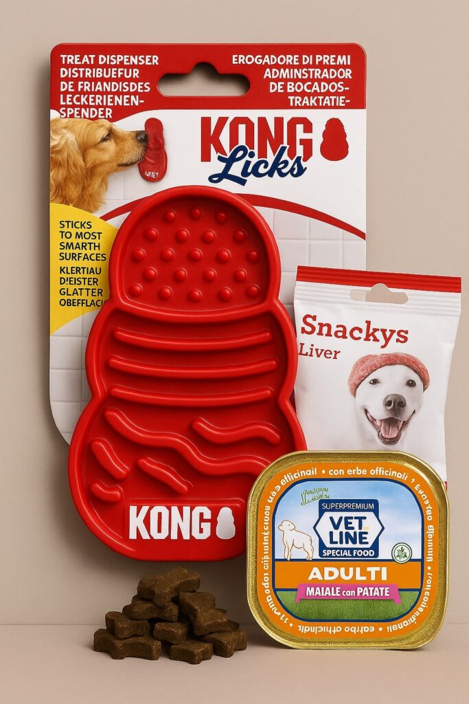 Include il KONG Classic in gomma naturale da riempire con i Snackys al fegato 100% naturali e l’umido Vet Line Bufalo e Patate, completo e gustoso. Perfetto per stimolare, premiare e nutrire il tuo cane in modo sano e intelligente.